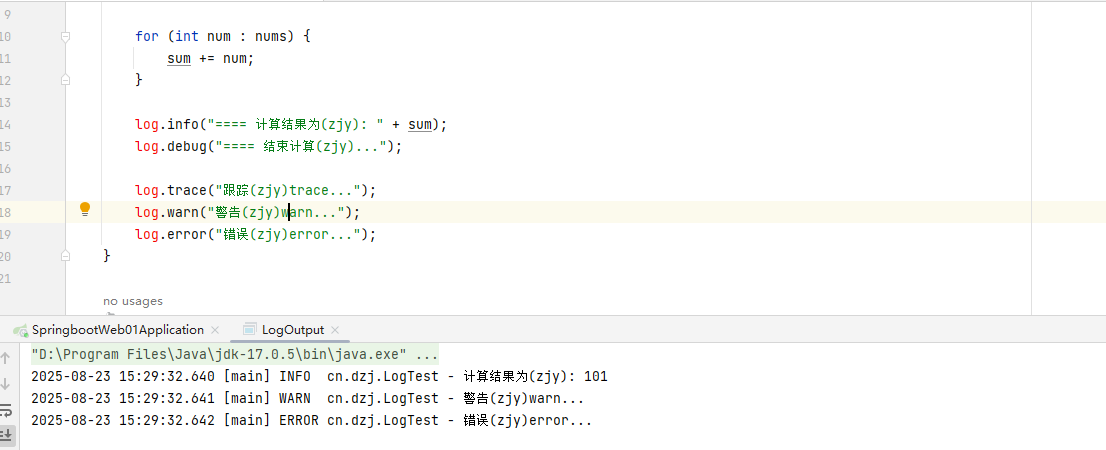 src/test/java/cn/zjy/LogTest.java testLog2()方法中加入下列3行