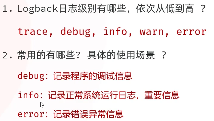 | info | 记录一般信息,描述程序运行的关键事件,如:网络连接、io操作 【使用较多】 | log.info("...") |