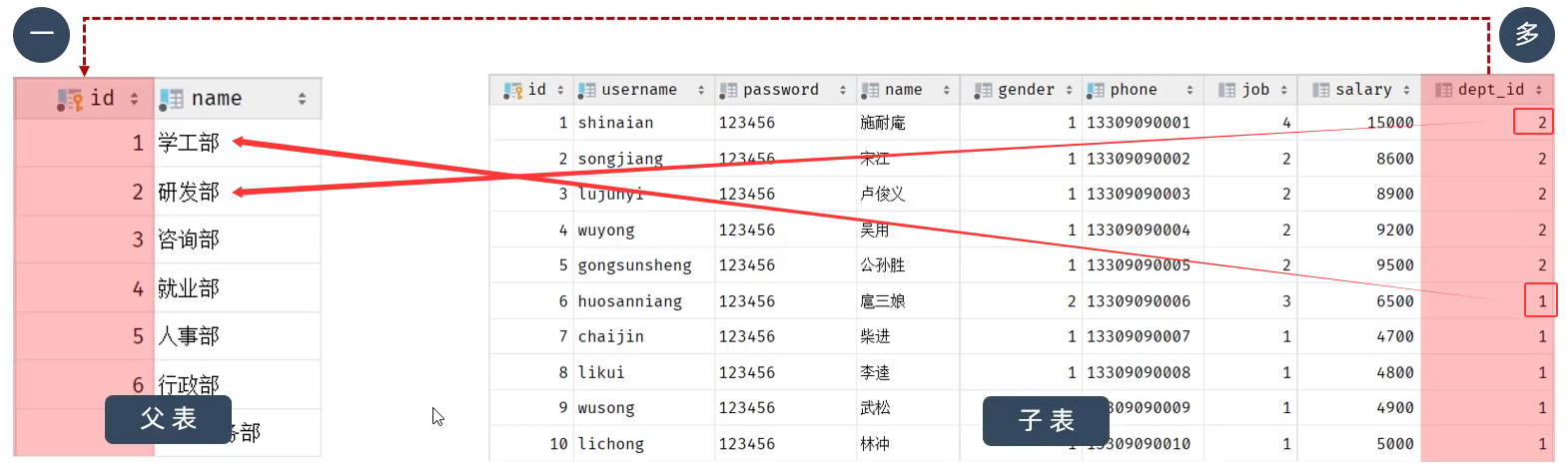 - 场景:部门与员工的关系 (一个部门下有多个员工)。