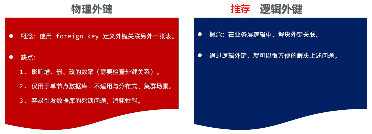 - 原因:目前上述的两张表,在数据库层面,并未建立关联,所以是无法保证数据的一致性和完整性的 。