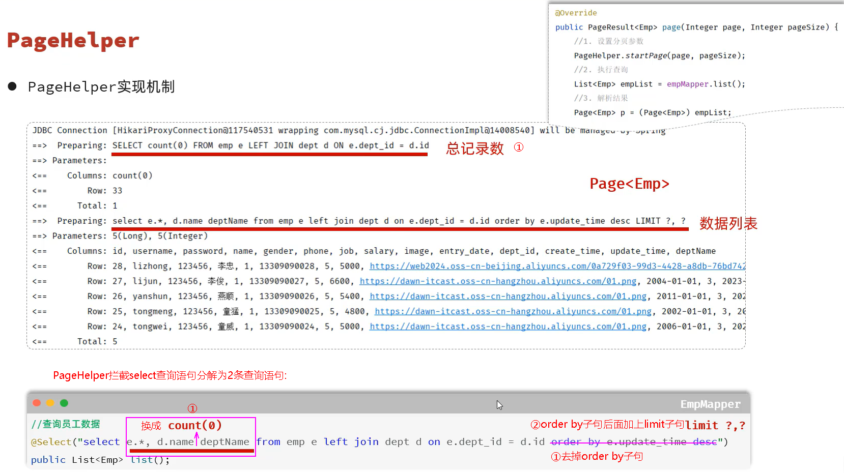 - PageHelper只会对紧跟在其后的第一条SQL语句进行分页处理