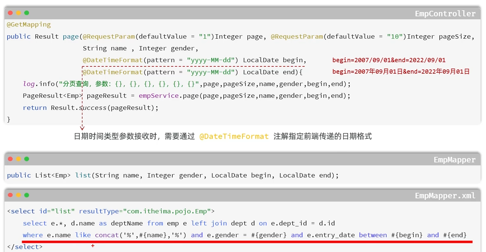 List<Emp> list3( String name, Integer gender, LocalDate begin, LocalDate end);