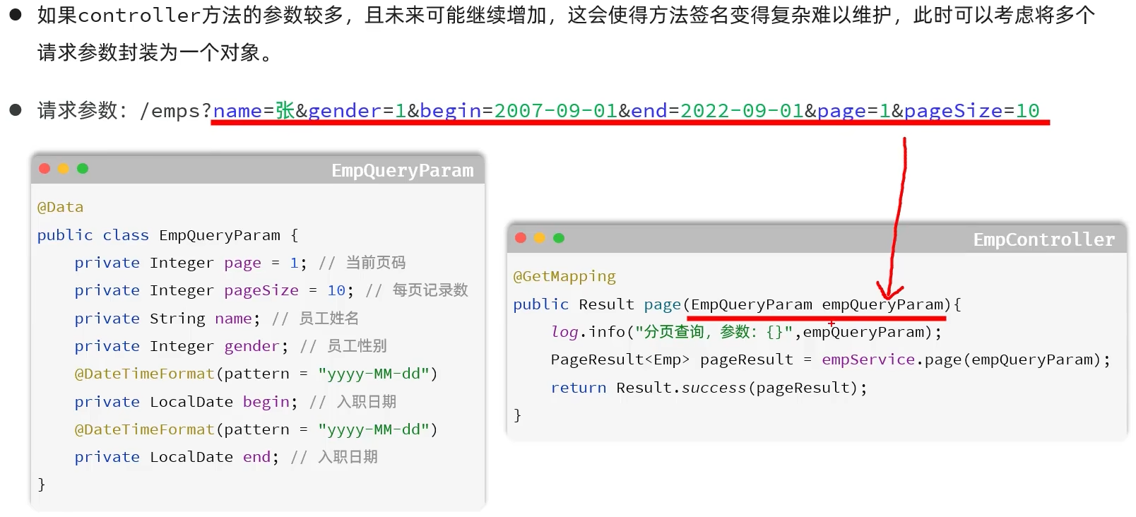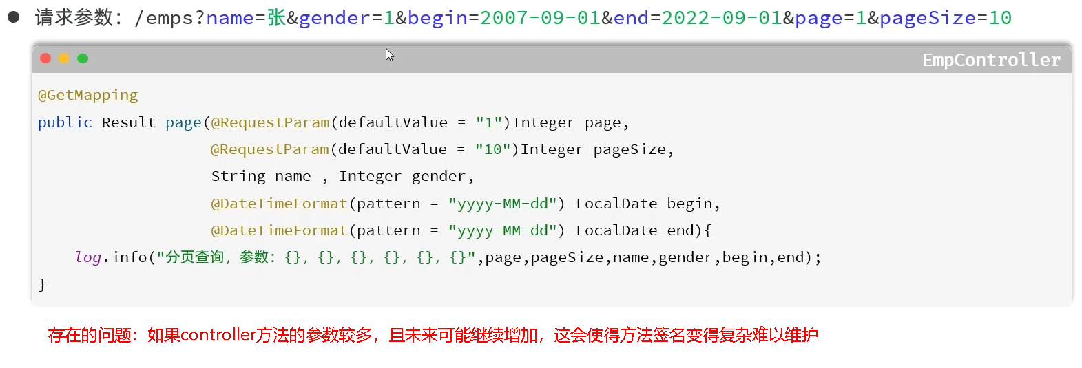 如果controller方法的参数较多,且未来可能继续增加,这会使得方法签名变得复杂难以维护,此时可以考虑将多个请求参数封装为一个对象。