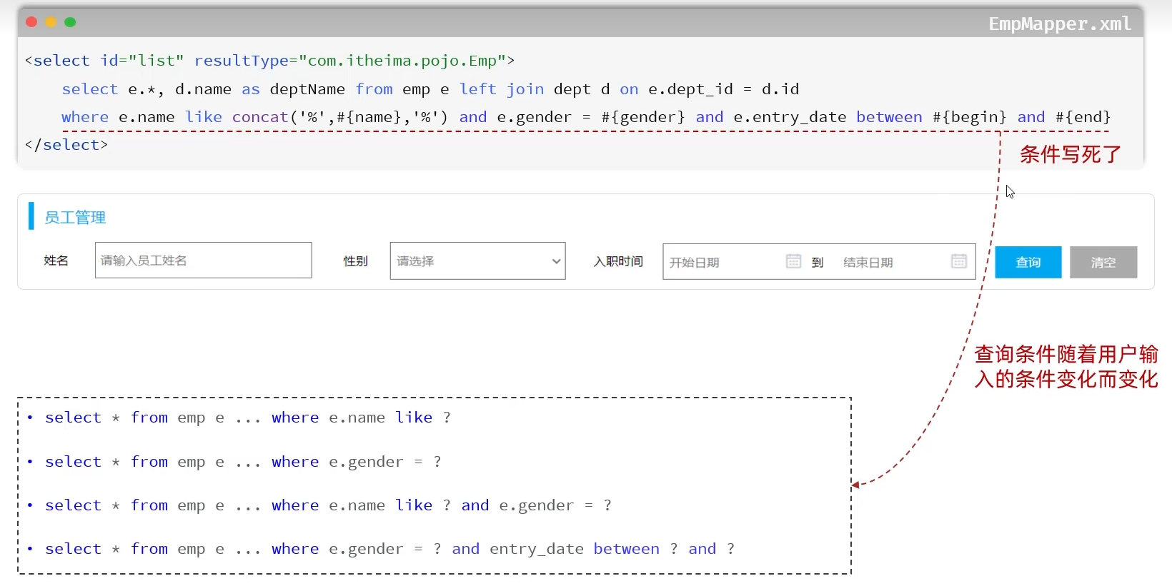 - 如果SQL语句是不固定的,是随着用户的输入或外部条件的变化而变化的