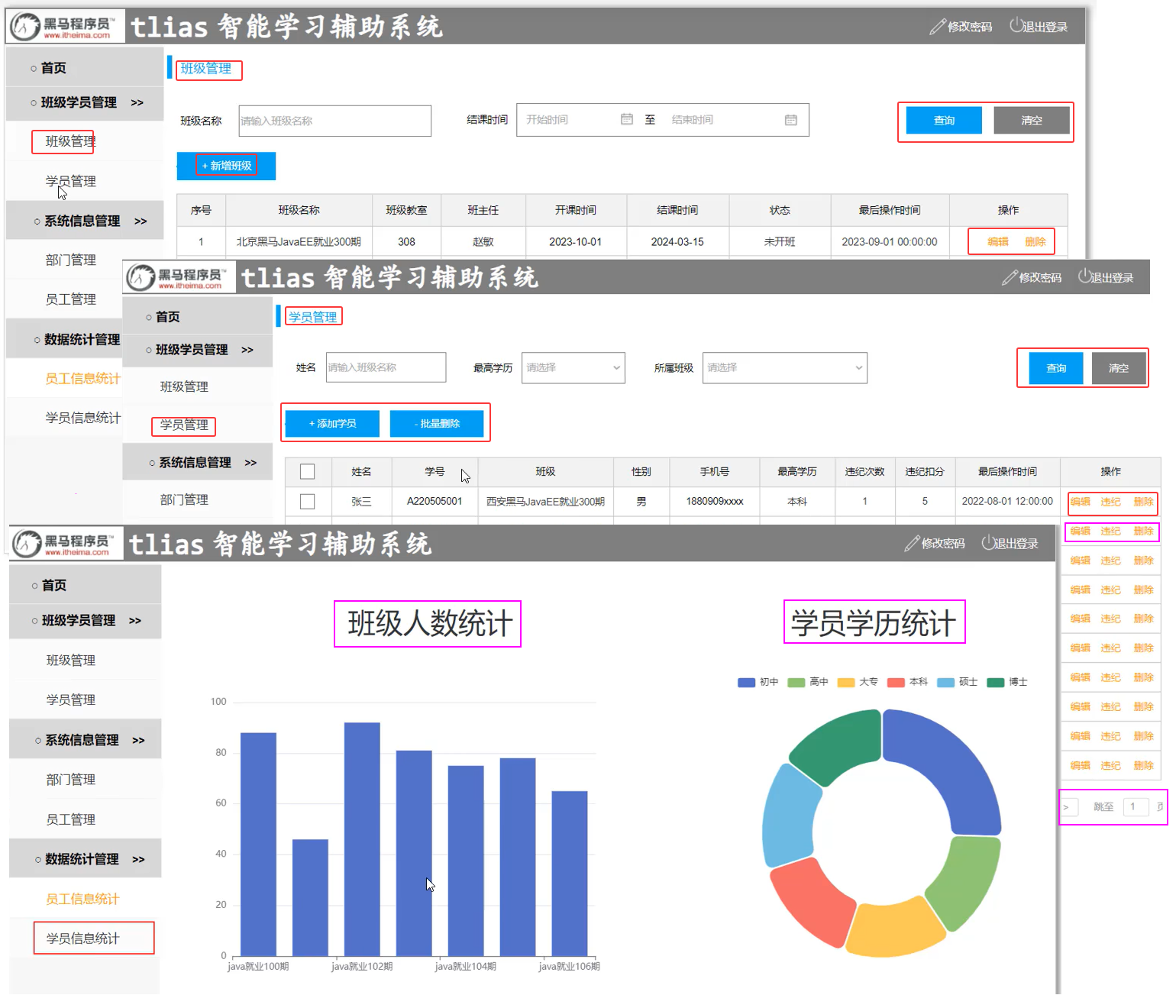 - 数据统计:班级人数统计、学员学历统计。