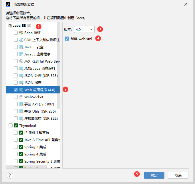 (2) 右击项目如[ch02_zjy]选【添加框架支持...】,弹出【添加框架支持】界面,选①JavaEE;②Web应用程序;③版本4.0;④创建Web.xml;⑤【确定】。