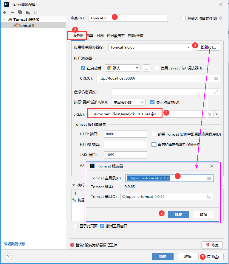 (12) 在Add New Configuration界面中,"Name" 后的文本框用于给配置的Tomcat命名,如Tomcat 9;"HTTP port"后的文本框可以设置Tomcat的端口号,默认是8080; "Configure"--【配置...】 按钮用于配置本地Tomcat的路径,单击 "Configure" 按钮,会弹出Tomcat Servers界面。