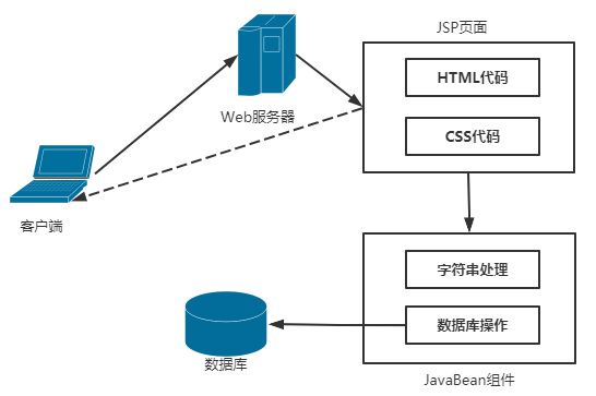 如果使HTML代码与Java代码相分离,将Java代码单独封装成为一个处理某种业务逻辑的类,然后在JSP页面中调用此类,可以降低HTML代码与Java代码之间的耦合度,简化JSP页面。提高Java程序代码的重用性及灵活性。这种与HTML代码相分离,而使用Java代码封装的类,就是一个JavaBean组件。在Java Web开发中,可以使用JavaBean组件完成业务逻辑的处理。应用JavaBean与JSP整合的开发模式如下图所示。