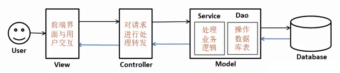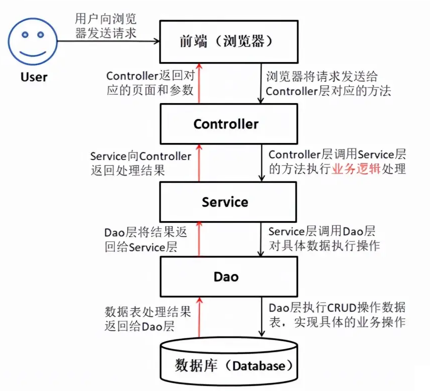 几乎所有的业务逻辑,实际上最后就是对数据库表的操作,Dao层面向数据库中的表,Service进行事务、业务逻辑的具体实现,Controller层对接收到的请求进行控制,然后负责调用Service层进行业务逻辑实现,Service层将逻辑处理中需要对数据库表的操作交给Dao层进行数据操作,最后将处理结果逐层返回给前端,用户就可以看到最后的处理结果。