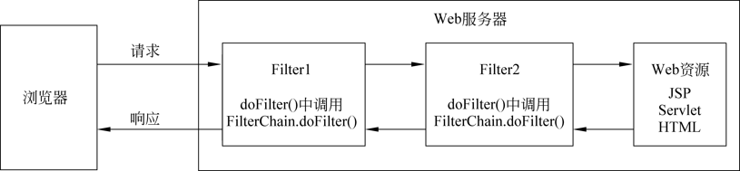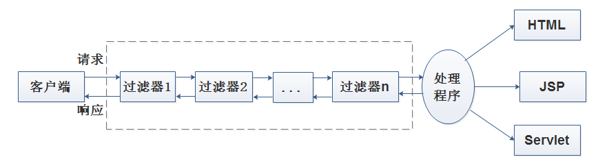在Servlet高级特性中,Filter被称为过滤器,Filter基本功能就是对Servlet容器调用Servlet的过程进行拦截,它位于客户端和处理程序之间,能够对请求和响应进行检查和修改。