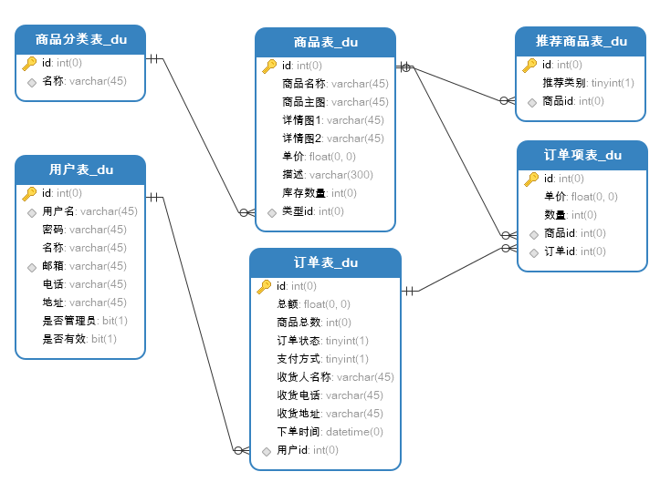 描述实体对象关系的模型——E-R图。E-R图也称实体-联系图(Entity Relationship Diagram),能直够直观地表示实体类型和属性之间的关联关系。根据网上蛋糕商城项目的需求,项目的核心实体对象设计包括用户实体、商品实体、订单实体、订单项实体、商品分类实体、推荐栏实体。