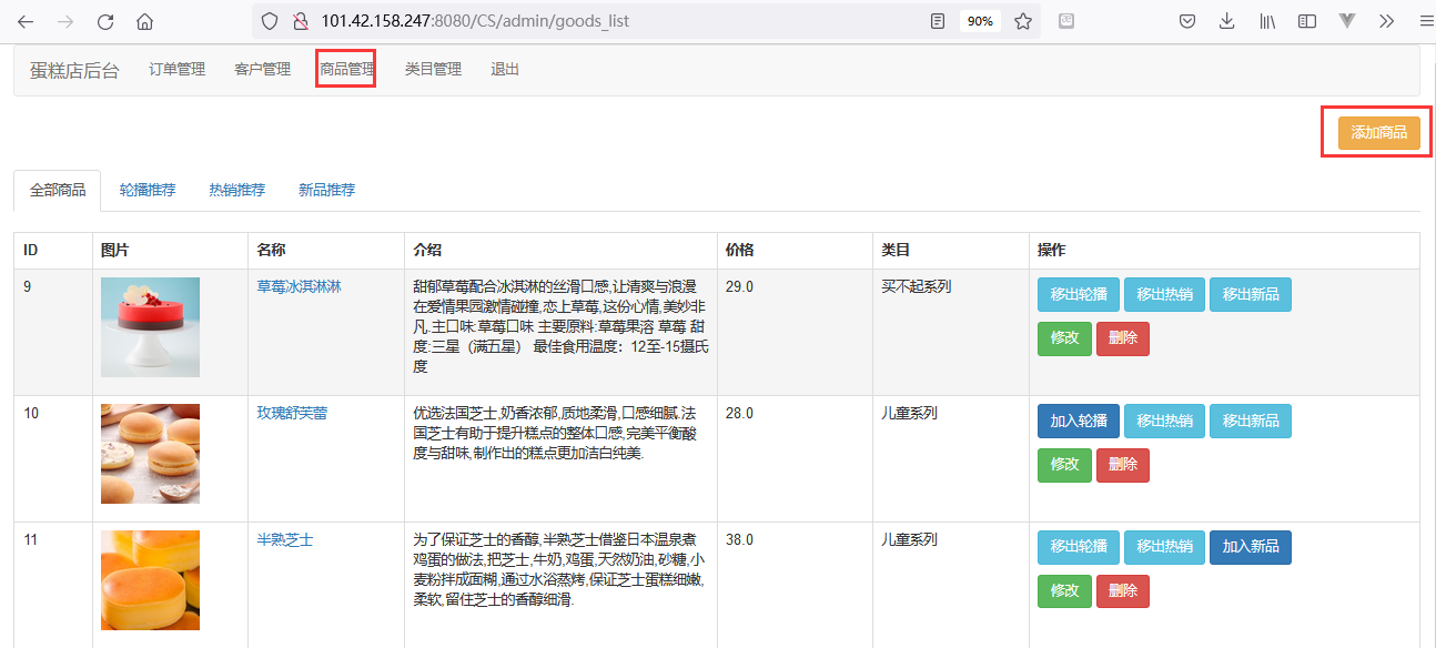 (11,'半熟芝士','picture/11-1.jpg','picture/11-1.jpg','picture/11-1.jpg',38,'为了保证芝士的香醇,半熟芝士借鉴日本温泉煮鸡蛋的做法,把芝士,牛奶,鸡蛋,天然奶油,砂糖,小麦粉拌成面糊,通过水浴蒸烤,保证芝士蛋糕细嫩,柔软,留住芝士的香醇细滑.',10,3),(12,'青森芝士条','picture/12-1.jpg','picture/1-2.jpg','picture/12-1.jpg',36,'青森芝士和风轻拂,,奶香浓郁,质地柔滑,口感细腻.',10,2),